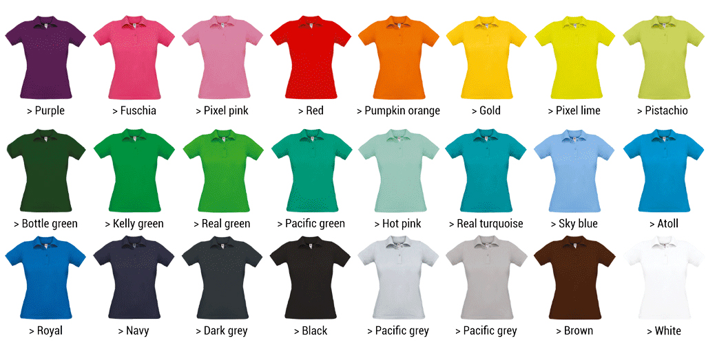 Polos piqués, coupe femmes marque B&C 180 grs/m², 100 % coton ringspun (Ash: 99 % coton, 1 % viscose, Heather Grey: 90 %coton, 10 % viscose), patte de boutonnage 3 boutons ton sur ton, bande de propreté, surpiqûres