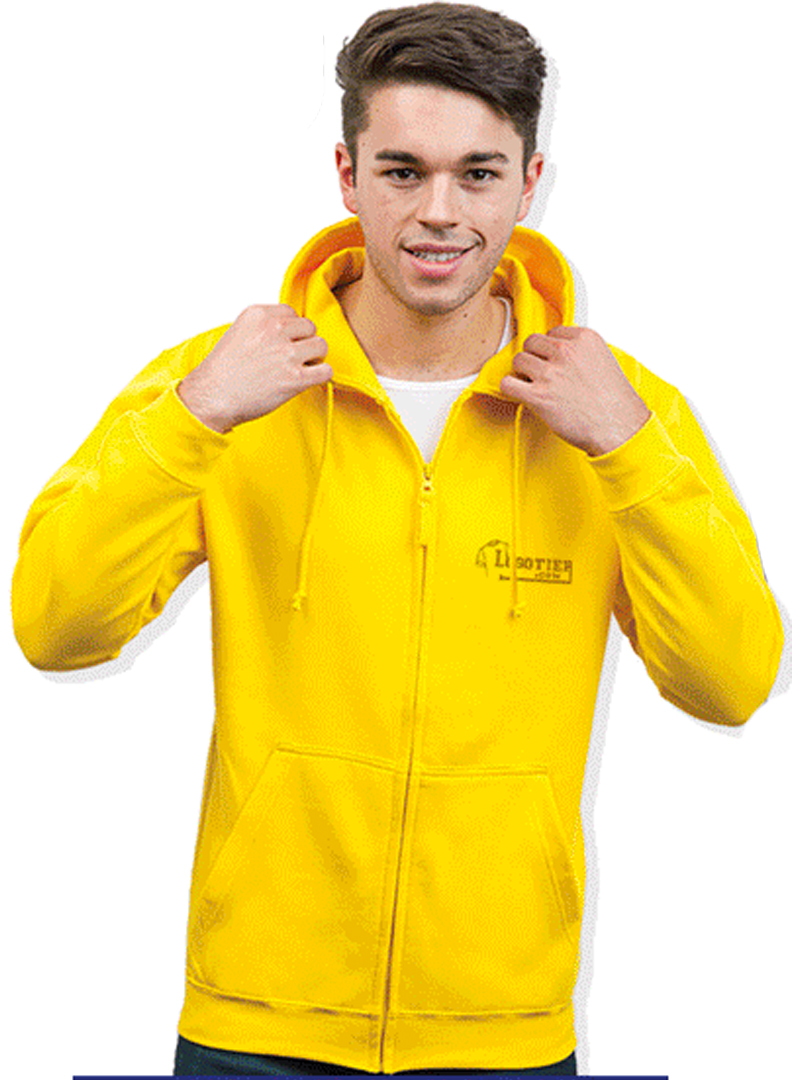 Coupe unisexe - zip intégral dissimulé par le tissu - Capuche à double épaisseur de tissu, cordons de la même couleur - Poche kangourou - Bord des manches et bords de l' intérieur côtelés.